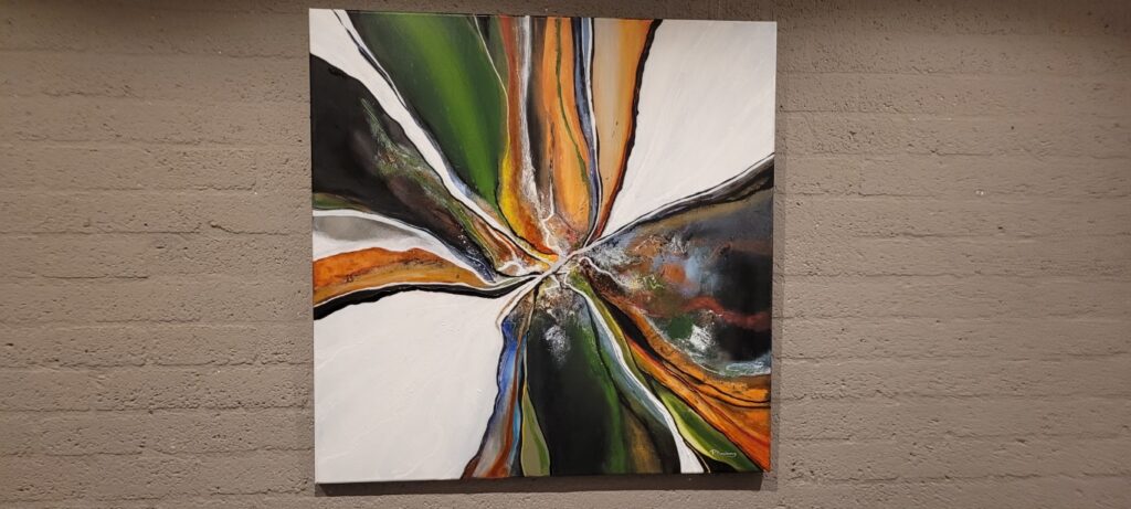 Wat mijn abstracte schilderijen zo uniek maakt, is mijn vermogen om chaos en rust met elkaar te verenigen. Ik laat mijn gevoel de ruimte nemen om zich te vertalen naar het doek, zonder beperkingen van vormen of representatie. Na de nodige mantelzorg die ik lever, vind ik hierin mijn ontspanning.