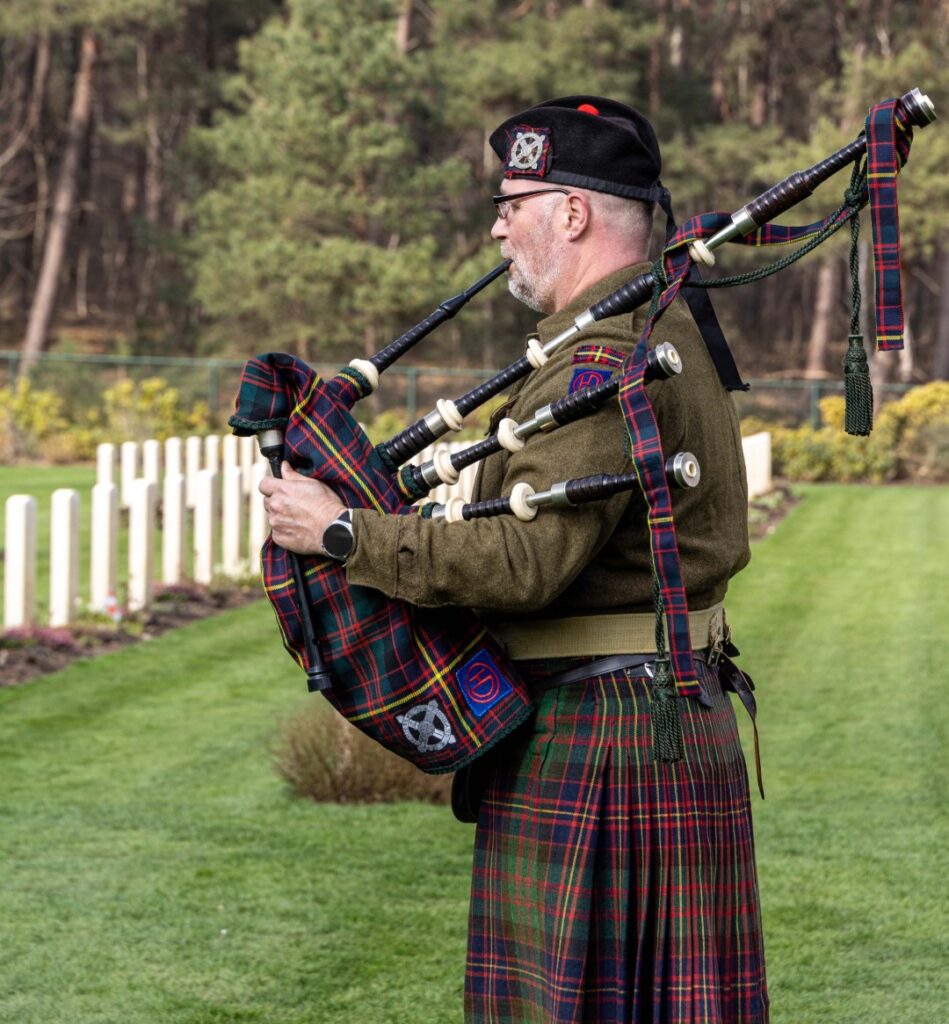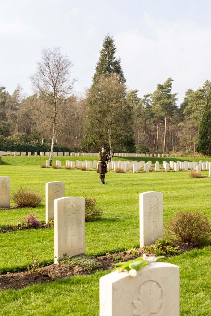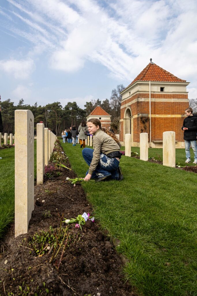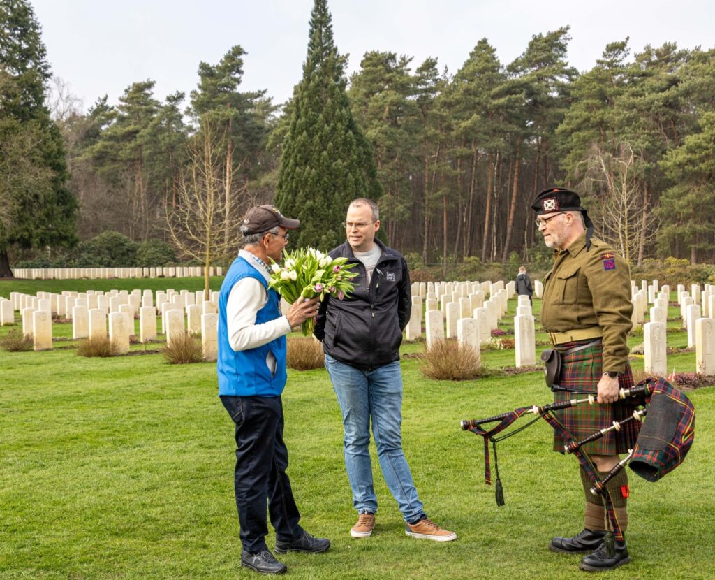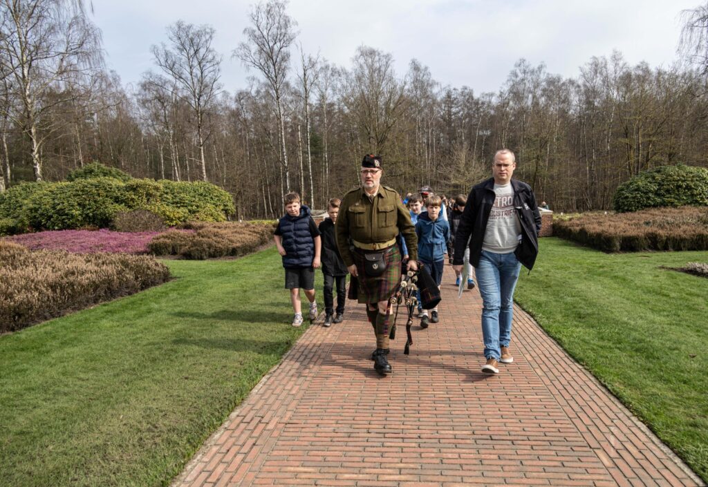 Als afsluiting werden bij de 46 graven rode en witte tulpen neergelegd door de leerlingen, onder muzikale begeleiding van Erwin Hoogenboom van de Highland Regiment Pipes and Drums, op doedelzak.