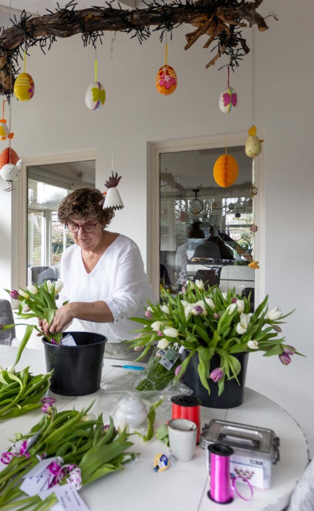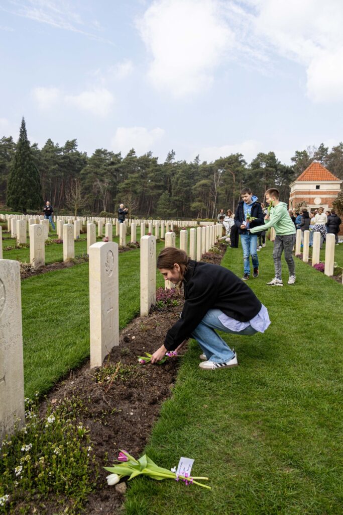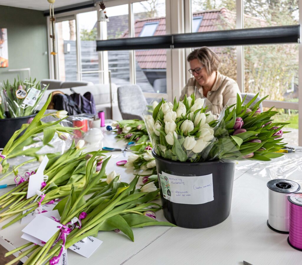 Voorafgaand aan het bezoek aan de begraafplaats waren de vrijwilligers druk bezig met de voorbereidingen. Zo werden de witte en rode tulpen samengevoegd tot mini-boeketten om bij de graven te plaatsen.