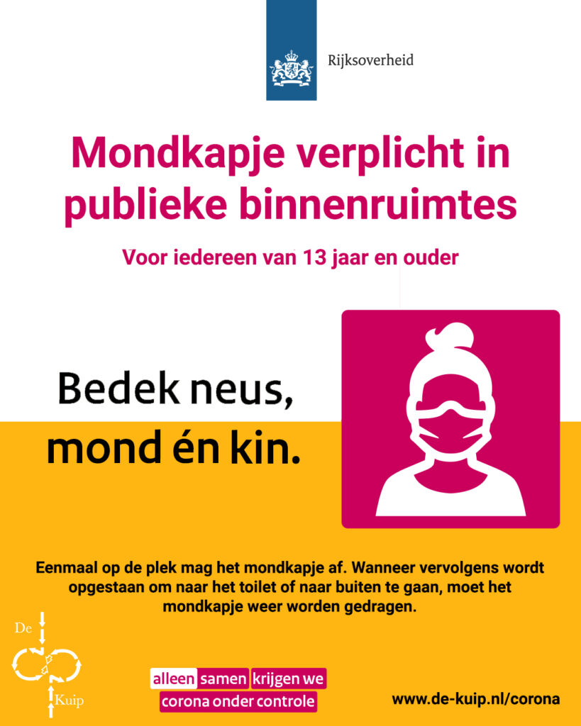Een mondkapje moet de neus en mond volledig bedekken en het moet ontworpen zijn om de verspreiding van virussen tegen te gaan. Medische mondneusmaskers zijn bedoeld voor de zorg; mondkapjes zijn geschikt voor gebruik in winkels, op school, in het OV en bij de kapper. Gebruik daarom bij voorkeur mondkapjes die te koop zijn bij de drogist of de supermarkt. Een spatscherm (faceshield) bedekt de neus en mond niet volledig, en mag daarom niet worden gebruikt als alternatief voor een mondkapje. Hetzelfde geldt voor bijvoorbeeld een sjaal of bandana. Tot het moment van de definitieve ingangsdatum is het mondkapje niet verplicht en kunnen mensen dus ook geen boete krijgen. Wel geldt er ook nu al een dringend advies. Meer informatie op de site van de Rijksoverheid.