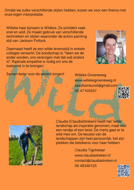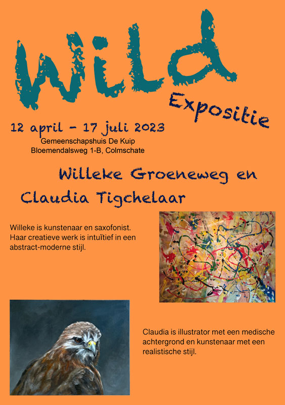 Colmschate – In gemeenschapshuis De Kuip is van 12 april t/m 17 juli een nieuw expositie te zien. De werken zijn gemaakt door kunstenaar en saxofonist Willeke Groeneweg en illustrator Claudia Tigchelaar (ClaudiaStreken). Vanwege de verschillende stijlen werken ze met het thema ‘Wild’ waaraan ze hun eigen interpretatie geven.