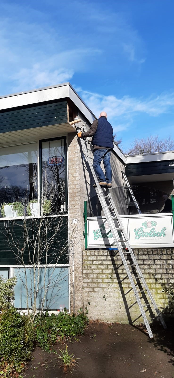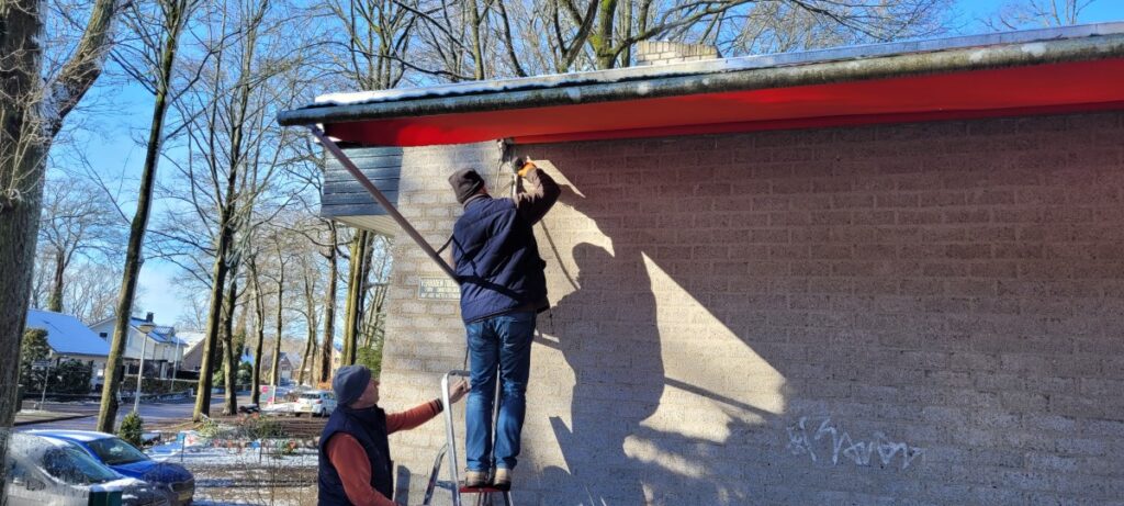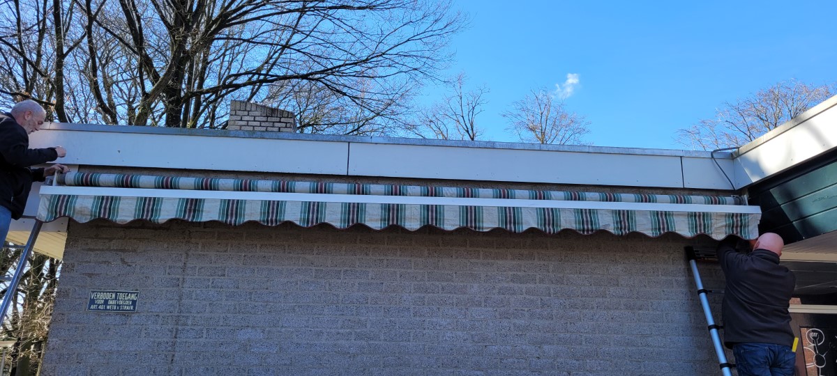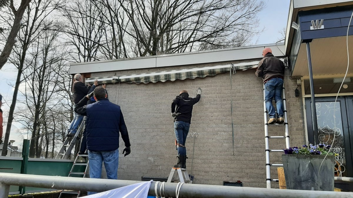 De focus lag op ons terras, maar dit was niet de enige plek waar gewerkt werd. Op het terras is het oude zonnescherm vervangen voor een andere. Hier is ook een begin gemaakt met het plaatsen van palen met een staalkabel waar de prikkabel LED verlichting aan komt te hangen. Echter was het zonnescherm meer werk dan gehoopt en zat het niet echt mee. Dus konden we niet de hele staalkabel monteren, dit werk maken de vrijwilligers van de week nog af.